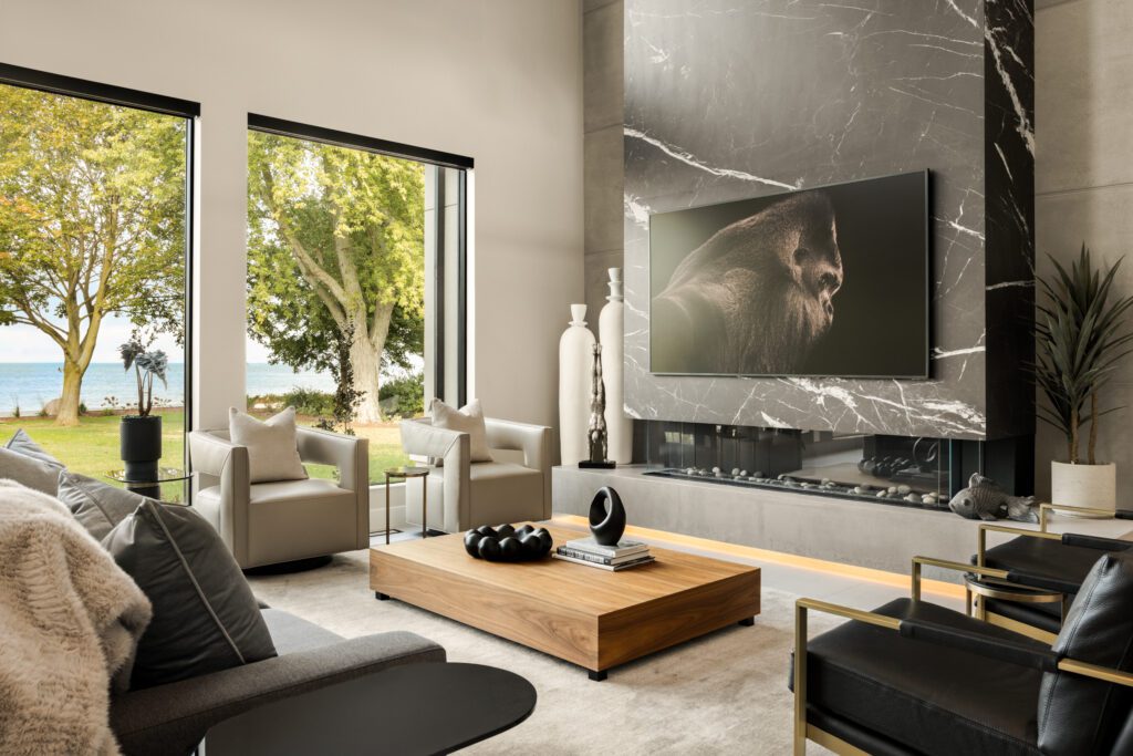 A project like this had to start with thoughtful, intentional design. Jodi explains how the interior and exterior of the home were designed to create a “home that feels cohesive from the moment you arrive.” The exterior architecture set the tone through its strong lines and modern materials used. Overall, these features created a “confident presence,” which the design team used to guide their interior decisions. When working on the interior spaces, Jodi says, “the team focused on scale, proportion and flow to ensure each space felt intentional and connected, rather than compartmentalized.” Finishes, colours, and textures were selected to complement the home’s spectacular views and enhance natural lighting inside the home, both day and night.