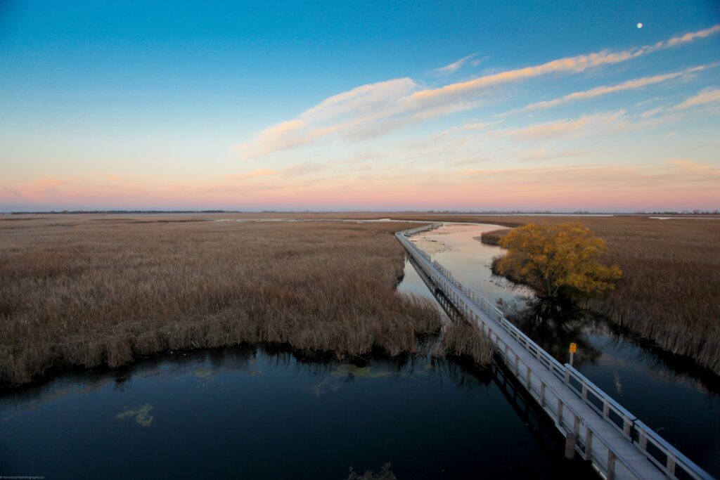 And lastly, the “golden hour” is your best friend. This time of day is when the sun is almost set but not quite. I suggest getting to your favourite location(s) around 5pm to scout some possible spots that will be the “one” for sunset. This boardwalk image is one I’ve taken numerous times at various times of the day and year. And I knew that time of day, late October, when I wanted to get this image. As the sun was setting behind me, the soft glow on the horizon overlooking the marsh was the exact look I was going for. I lucked out that the moon was full that evening as well.